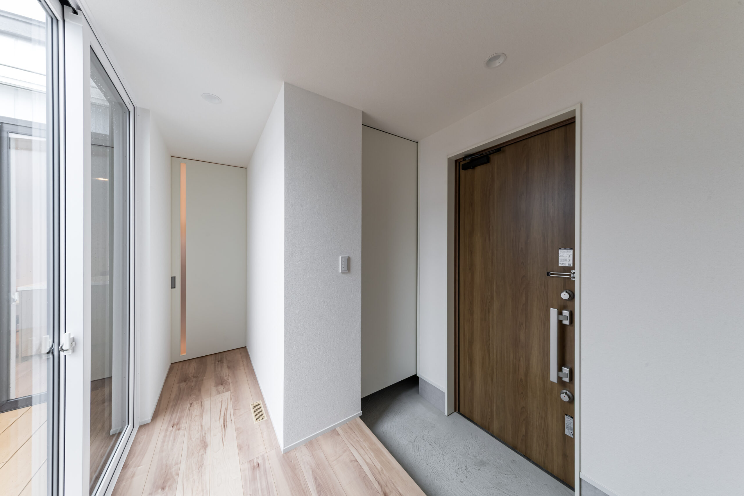 玄関を開けると中庭からやわらかな光が差し込みます。