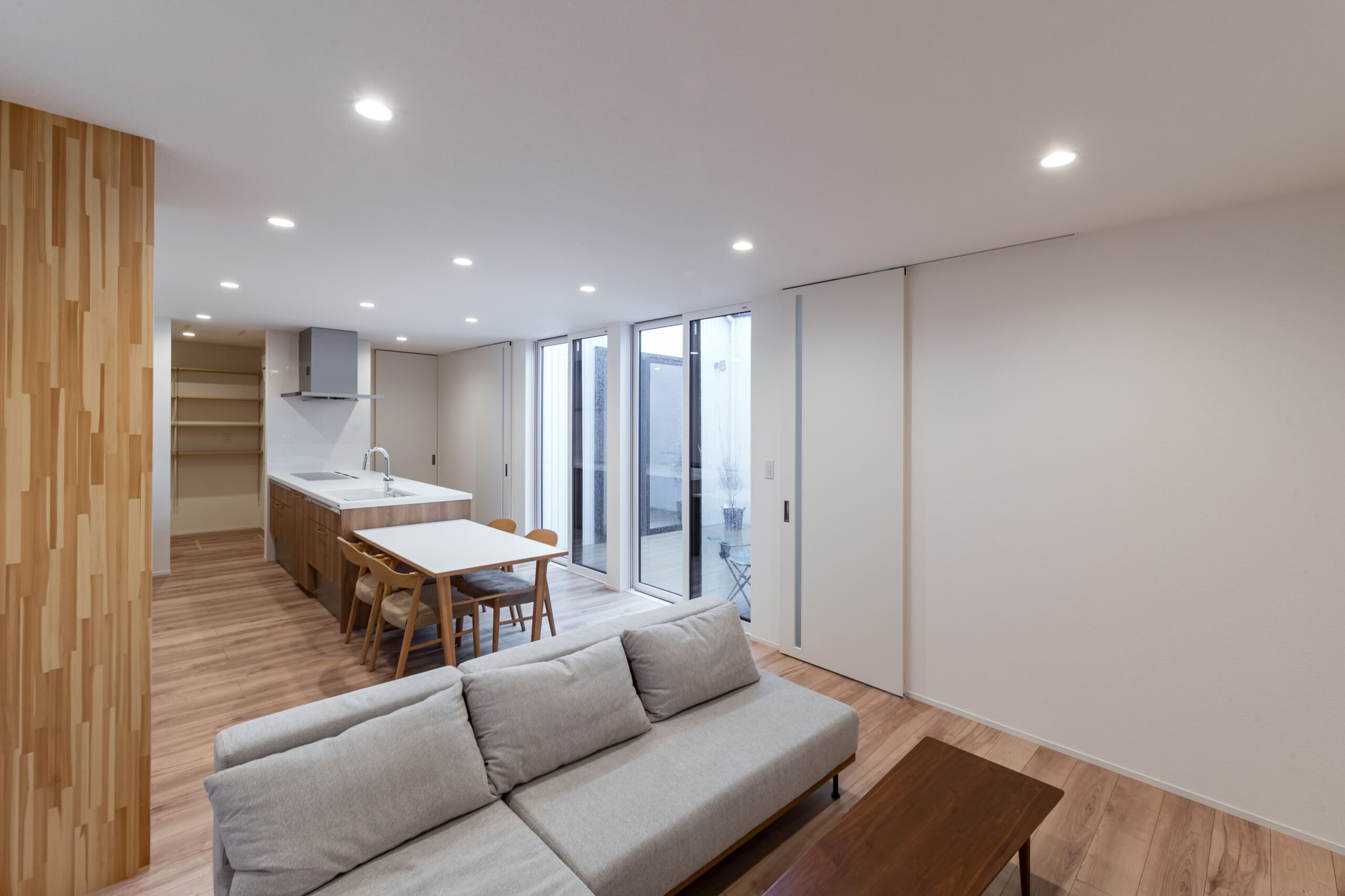 キッチンに立つと、リビング・ダイニングはもちろん中庭まで全てを見わたせるレイアウト。